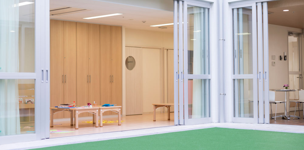 多機能型多世代共生施設を目指して作り上げた、この施設ならではの風景です。今、保育園の園児たちが保育士さんに誘導されて、デイサービスのエリアに移動しています。さあて、これからどんな楽しいことが待っているのかな?