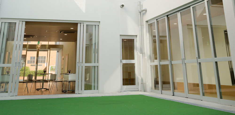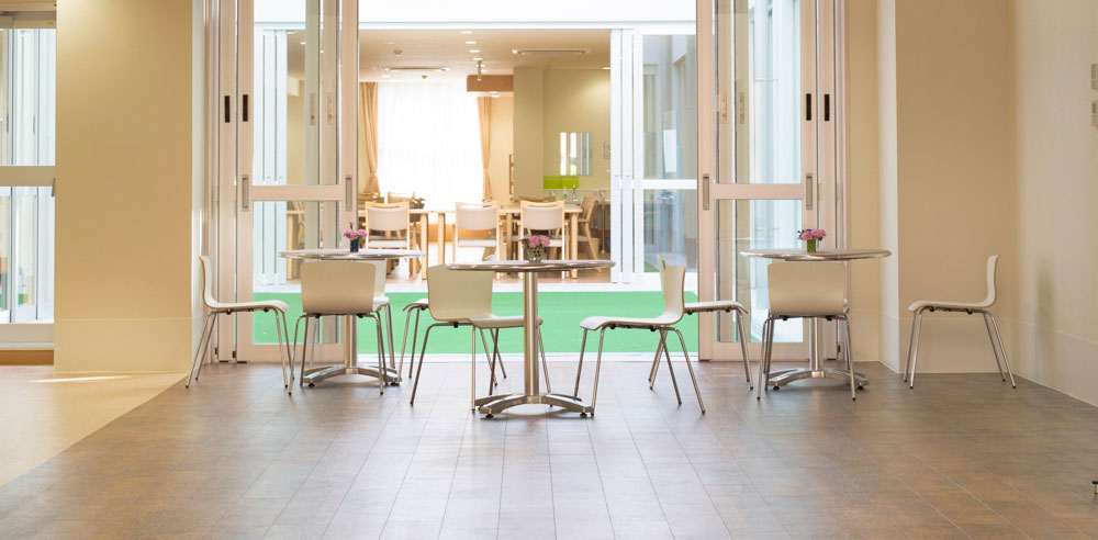 多機能型多世代共生施設を目指して作り上げた、この施設ならではの風景です。今、保育園の園児たちが保育士さんに誘導されて、デイサービスのエリアに移動しています。さあて、これからどんな楽しいことが待っているのかな?